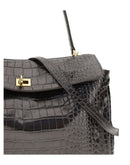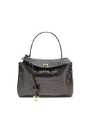 Leather Medium Rodeo Handbag by Balenciaga, single removable top handle, charm with key ring detail applied at base of handle, dual compartment, flap closure with swivel system at front, crocodile-effect leather design, double welt pocket on back panel.