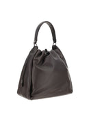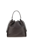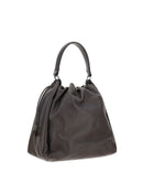 Leather Shoulder Bag by Brunello Cucinelli, top closure by drawstring, adjustable and removable flat handle at top, one compartment, iconic brand signature press-stamped on front.