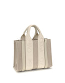 Chloé’s Woody Handbag is an elegant and practical accessory made of linen and detailed with contrasting leather. The concealed button top closure maintains a clean design, while the double flat handles and extension on the leather side panels add sophistication. The removable and adjustable leather shoulder strap also allows it to be carried on the shoulder, offering versatility. Inside, a welt pocket keeps smaller items tidy, while the brand’s iconic signature is affixed to the side panels, lending a distinctive touch.