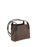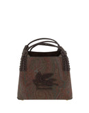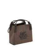 The Libra Shoulder Bag by Etro is an elegant and functional accessory featuring the iconic paisley pattern, which covers the entire surface of the bag, giving it a distinctive and sophisticated look. The two top handles are woven, adding a handcrafted and refined touch. Inside, the bag features a single compartment with a zippered welt pocket for safe and organized storage of smaller items. The closure is secured by snap hooks, offering added convenience. The brand’s iconic Pegasus logo is applied to the front, while metal feet at the base protect the bag from damage and ensure stability.