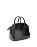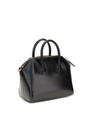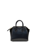 Givenchy Antigona Leather Handbag, glossy leather design, geometric pattern, two rigid top handles, top closure by zipper with double slider, contrasting iconic brand monogram on front, adjustable and removable shoulder strap, attached support feet at base of bag.