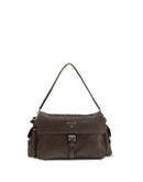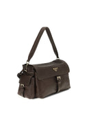 Explore large Shoulder Bag by Prada is made of Re-Nylon and features a flap with a classic enameled metal triangle logo. It features a padded ribbon handle, front zipper pocket, side flap pockets, and metal trim. The closure combines zipper, flap and strap. The interior, also made of Re-Nylon, includes a patch pocket.