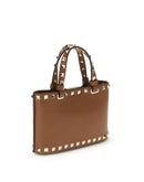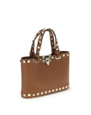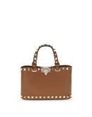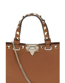 The Mini Shopping Rockstud by Valentino Garavani is crafted from grained calfskin and can be worn on the shoulder, cross-body, or carried by hand thanks to its handles and removable chain. It is adorned with studs and metal parts in a platinum finish and features a hook closure. The nappa lining and interior with two card slots complete this versatile and refined bag.