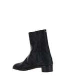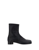 Calfskin Tabi Boots by Margiela, slit closure on inner side panel, leather block heel, brand’s iconic Tabi toe on front, iconic contrast stitching on back.