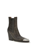 The Dallas texan Ankle Boots by Paris Texas are made of vintage black leather with an embellished metal toe cap, with a bold and gritty character. The block heel provides comfort and momentum, while the tapered silhouette makes them perfect for bold, urban looks.