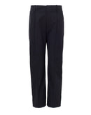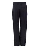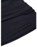 High waist, front fastening with covered hooks, two side pockets, one back pocket closed with covered zip, central seam on the leg, on the bottom openable button.