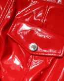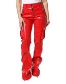 pants feature a striking red glossy finish with a modern cargo design and boot-cut silhouette. Crafted from premium polyester, they blend utilitarian edge with high-fashion flair for a standout contemporary look.
