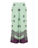 Gucci Print Silk Palazzo Pants. In aqua green and purple, with contrasting polka dots and flower print. Side zip opening, no button, two side welt pockets, wide leg.