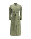 The silk Dress by Ella balances sophistication and practicality through a harmonious blend of style and lightness. Crafted from pure silk, it features a utility-inspired design with four applied pockets: two smaller ones on the chest and two larger ones on the lower part. The button-down front and classic collar lend understated elegance, while the cuffed sleeves enhance its tailored appeal. A matching scarf, separate from the dress, completes the look with a fluid and refined touch.