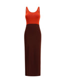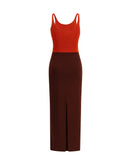 Fendi’s long knit Dress features a fitted silhouette and sleeveless design with thin straps and a wide round neckline. Made of viscose yarn with a color-block pattern, it combines elegance and modernity in a sleek, feminine silhouette.