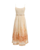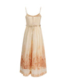 The Wanderlust Corset Midi Dress by Zimmermann from the Resort 2026 Collection captures the brand’s signature romantic and refined aesthetic. Crafted from 100% cotton in coral Toile print, it features a structured, boned bodice that defines the waist, enhanced by a rouleau tie belt that knots at the side. Adjustable straps, a gathered back with invisible zip closure, and side pockets offer both functionality and comfort, while the lined full skirt adds graceful volume and movement.