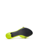 Slightly pointed, in fluorescent yellow leather, with a studded strap and silver-tone hardware.