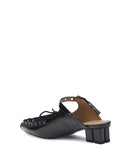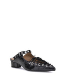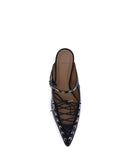 Ganni’s Oleatex laced Mules are inspired by the lace-up boots of the 1920s, combining nostalgia and contemporary appeal. Made of crinkled Oleatex Fabrics of the Future, they feature metal eyelets, waxed crisscross laces, a long tapered toe, and an iconic mini heel with a GANNI butterfly logo and chrome finish for a distinctive, modern touch.