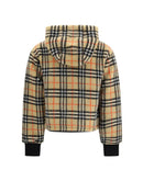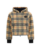 The cropped hooded Check fleece Jacket by Burberry is crafted from a soft cashmere and wool blend knit, featuring the house’s signature Burberry Check in archive beige. Designed with a cropped cut and regular fit, it includes a breathable mesh lining for enhanced comfort. Functional details such as the two-way zip closure, side zip pockets, and drawstrings at the hem and hood meet heritage touches like the silicone Equestrian Knight Design patch at the chest — a nod to an archival emblem from the 1980s.