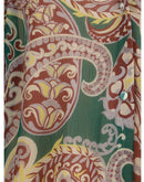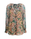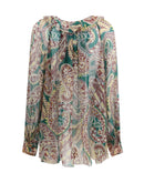 Made of lightweight silk crepon with a see-through effect, Etro’s shirt is distinguished by its ethereal elegance and the house’s iconic all over Paisley print. The deep V-neckline is enhanced by delicate tone-on-tone ruffles, while the wide long sleeves and asymmetric hemline give movement to the garment. At the back, soft pleats add volume and lightness. Completing the design is a covered button closure, in perfect harmony with the shirt’s refined and feminine style.