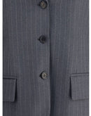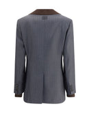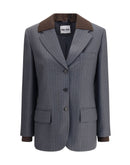 Miu Miu’s striped Blazer combines classic elegance with contemporary details. The single-breasted design features two welt flap pockets, a breast pocket and peaked lapels, while the ribbed collar and double sleeves add a touch of originality. The embroidered logo on the back completes the garment with an understated yet distinctive signature.