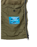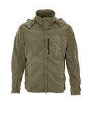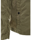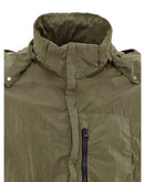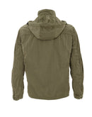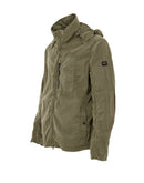 Paul & Shark Green Technical Fabric Lightweight Jacket. Covered zip front, two side pockets with buttons, one side pocket with exposed zip, high collar with adjustable and removable hood. Crinkled fabric with an iridescent effect.