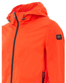 Paul & Shark Orange Lightweight Technical Fabric Jacket. Zip front, two zipped side pockets, high collar with adjustable hood. Rainproof technical fabric, logo applique on the sleeve. Composition: 100% Polyester