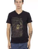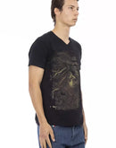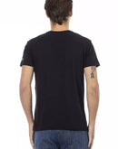 Unveil your fashion-forward spirit with the ‘Trussardi Action’ V-neck T-shirt, a piece that speaks volumes with its crisp black hue and bold front print. Perfect for the modern trendsetter, this tee meshes comfort and style, making it an essential addition to any discerning wardrobe. Dare to stand out in the crowd with Trussardi Action’s commitment to quality and luxury.