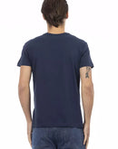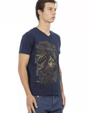 Dive into the epitome of casual sophistication with Trussardi Action’s impeccably crafted V-neck T-shirt. The striking front print adds a dash of bold flair, ensuring you stand out with effortless style. Crafted from a harmonious blend of cotton and viscose, experience unmatched comfort and breathability. Tailored for the trendsetters, this blue-hued piece is more than just a T-shirt; it’s a statement.