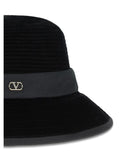 VLogo Fedora Hat by Valentino is made of cotton and embellished with an elegant velvet strap. The front features the Signature VLogo metal detail with an antiqued brass finish for an iconic and sophisticated touch.