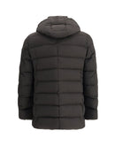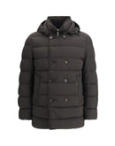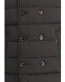 Moorer’s Florio Down Jacket is a straight-cut, double-breasted jacket made of water-repellent, compact and durable bi-elastic resin-coated fabric. Filled with goose down and boudin quilted, it offers warmth and lightness. Equipped with a removable hood, double horn button closure and metal zipper, it features side welt pockets and two inside valuables pockets.