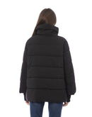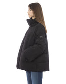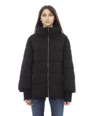 Indulge in the epitome of Italian elegance with the Baldinini Trend Short Down Jacket. This sleek black piece is not only stylish but also functional, boasting external threaded pockets for your essentials. Its adjustable hood caters to your comfort in any weather, while the Baldinini Trend metal monogram adds a signature touch of luxury. With a front closure featuring a chic zip and pull, this jacket combines practicality with high fashion sensibility, perfect for the bold and trendy woman on the go.