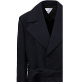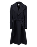 Double Cotton Canvas Trench Coat in Bottega Veneta Blue. Front fastening with covered buttons, removable belt, two side welt pockets, Ulster collar, small vent on the back, unlined.