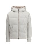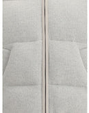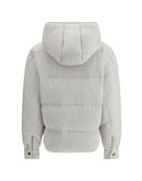 Lurex Padded Down Jacket by Brunello Cucinelli is a garment that flawlessly combines practicality and luxury. The hooded design offers extra protection against the cold, while the front closure with a double-slider zipper allows for easy and versatile adjustment. The two side welt pockets are perfect for storing small items securely. Applied all-over lurex gives the down jacket a shimmering, sophisticated effect, while the ribbed design adds an interesting touch of texture. Padded and quilted, this down jacket provides optimal warmth, making it ideal for the colder seasons without sacrificing style and elegance.