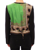 Classic black blazer featuring deep V-neck, button-down front, buttoned sleeves, buttoned tab on the backside. D&G silk blend blazer has scarf printed silk inserts to the backside. Logo details.