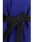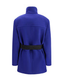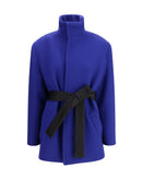 The wool boxy belted Coat by Saint Laurent reimagines a short, structured silhouette with a bold couture attitude. Oversized shoulders sculpt the shape, while the buttoned stand collar frames the neckline with sharp precision. A concealed button placket preserves the clean lines, complemented by discreet front welt pockets. A contrasting belt, tied at the waist, brings definition and a refined sense of ease. The silk twill lining finishes the piece with understated luxury.
