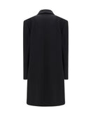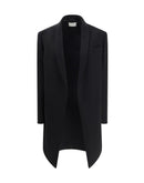 The Fedra Coat by The Row is a handcrafted piece made from virgin wool flannel, featuring a comfortable fit and an open front design that embodies relaxed sophistication. It includes notched lapels and side seam pockets, showcasing the meticulous craftsmanship and refined tailoring that define the brand.