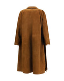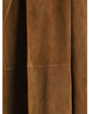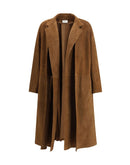 The Serenis Coat by The Row is crafted from supple lamb suede in a warm chestnut hue, showcasing the brand’s understated sophistication. Its unlined construction and single-button front closure enhance the material’s natural drape, creating an effortlessly fluid silhouette that layers beautifully over both tailored and relaxed looks.