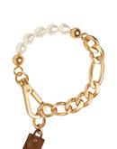 bracelet, crafted in gold-tone brass. Featuring delicate faux pearls and signature logo charm embellishment, it offers a refined yet glamorous touch. Perfect for pairing with both everyday outfits and sophisticated evening looks for a hint of luxurious Italian style.