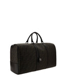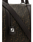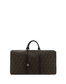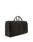 Boston Travel Bag by Fendi, two leather top handles, jacquard design with iconic FF monogram repeated all-over, top closure by double-slider zipper, adjustable and removable leather shoulder strap by snap hooks., large single interior compartment.