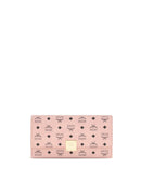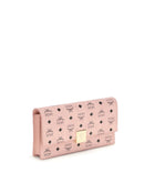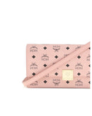 The Aren Wallet by MCM is made of coated canvas with a Visetos pattern print across the entire surface, enhanced by a metallic logo detail on the front. It features a removable leather shoulder strap and magnetic button closure. It features a slit pocket on the back, while the interior offers a slit pocket, a zippered pocket and four credit card slots.