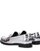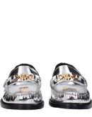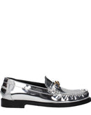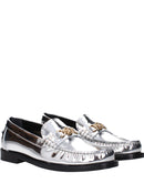 The product with MPN 10121231A043021E01V and code F83780 leather in silver is a loafers designed by Versace. It has features like front logo, metallic effect.