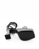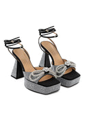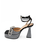 Black Platform Sandals with Crystals Double Bow Mach & Mach. Square toe, crystal band with double bow, covered with crystals on the platform and heel. Bell-shaped heel, ankle strap and drawstring fastening. Platform height: 3,5 cm-Interior skirt:24MAR12