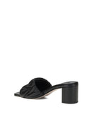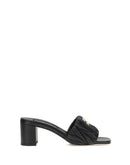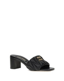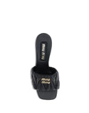 Miu Miu’s lambskin Sandals combine elegance and comfort in a sophisticated design. With a squared toe and padded straps, they are embellished with a metal plaque featuring the iconic Miu Miu monogram on the front. The geometric heel lends a bold, modern touch, while the branded insole adds an exclusive, classy detail.
