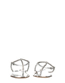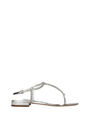 The product with MPN 5Y920D3L1N010F0118 and code F76545 leather in silver is a flip flops designed by Miu Miu. It has features like metallic effect, rhinestone.