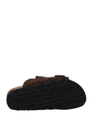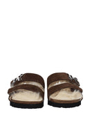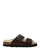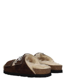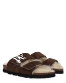 The product with MPN PWIH021LEA0016061 and code F79074 suede in brown is a slippers and clogs designed by Palm Angels. It has features like front logo.