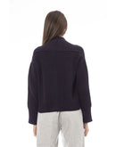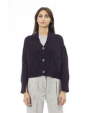 Wrap yourself in pure luxury with Alpha Studio’s latest offering – a cardigan that perfectly embodies timeless elegance with a bold twist. Its rich purple hue commands attention while the fine ribbed collar, cuffs, and bottom add subtle sophistication. The button closure ensures a seamless look, complemented by convenient front pockets for a touch of practicality. Crafted from a plush blend of Merino wool, Alpaca leather, and Polyamide, this Italian-made statement piece exudes comfort and high-end fashion.