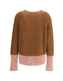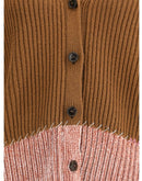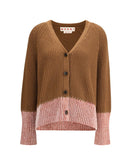 Marni’s brown cardigan in fine wool, with chenille underside in shades of pink, connected via faux raw seams in shades of beige, carefully handcrafted in Italy. Elegant and versatile design, perfect for pairing with both casual and formal looks.