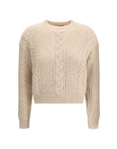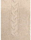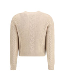 The cropped boxy Sweater by Max Mara Studio, crafted from a soft alpaca-blend yarn interwoven with metallic fibers for a touch of shine and character. The all-over cable and textured knit enrich the design, while the crew neck and dropped shoulders evoke a modern, effortless sophistication.