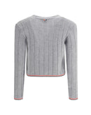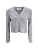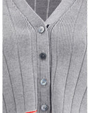 Virgin wool cropped Cardigan by Thom Browne features a V-neck front and button closure. The ribbed design lends a refined, structured look, while adjustable side slits with buttons offer versatility and comfort. The hem and cuffs are embellished with the iconic colored bands, a distinctive symbol of the brand. An elegant and contemporary garment, perfect to enrich any outfit.