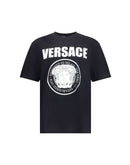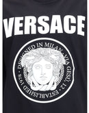 Cotton T-Shirt by Versace featuring a ribbed crew neck and iconic contrasting monogram on the front, embellished with a Medusa maxi head. A distinctive garment that combines comfort and bold style.