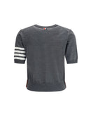 Thom Browne’s knit T-Shirt is a garment with a clean and distinctive style. With a ribbed crew neck and hems, it features the brand’s iconic bands on the left sleeve, a detail that underscores its unique identity. The ribbed hem with slight side slits adds a touch of modernity and comfort, making it perfect for a casual yet sophisticated look. A versatile must-have for any wardrobe.