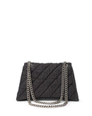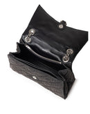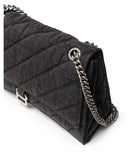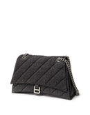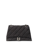 Crush Medium Denim Shoulder Bag. In black denim, iconic and slightly curved structured shape, chain shoulder strap and metal logo on the front. Covered snap button closure, two internal compartments and zip pocket