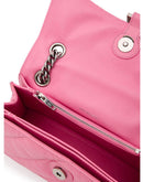 Matelassé style, curved design, covered snap closure, silver metal B logo, two internal compartments with zip pocket, double chain.