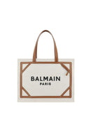 Cotton B-Army Medium Shoulder Bag by Balmain features flat top leather handles, contrasting embroidered iconic brand monogram at front, leather details, top hook closure, interior pouch, single interior compartment